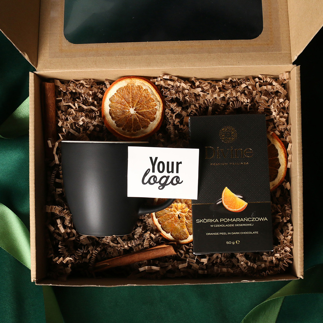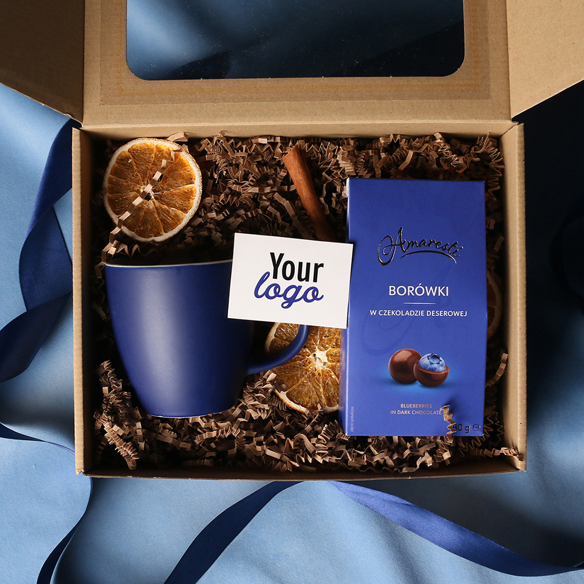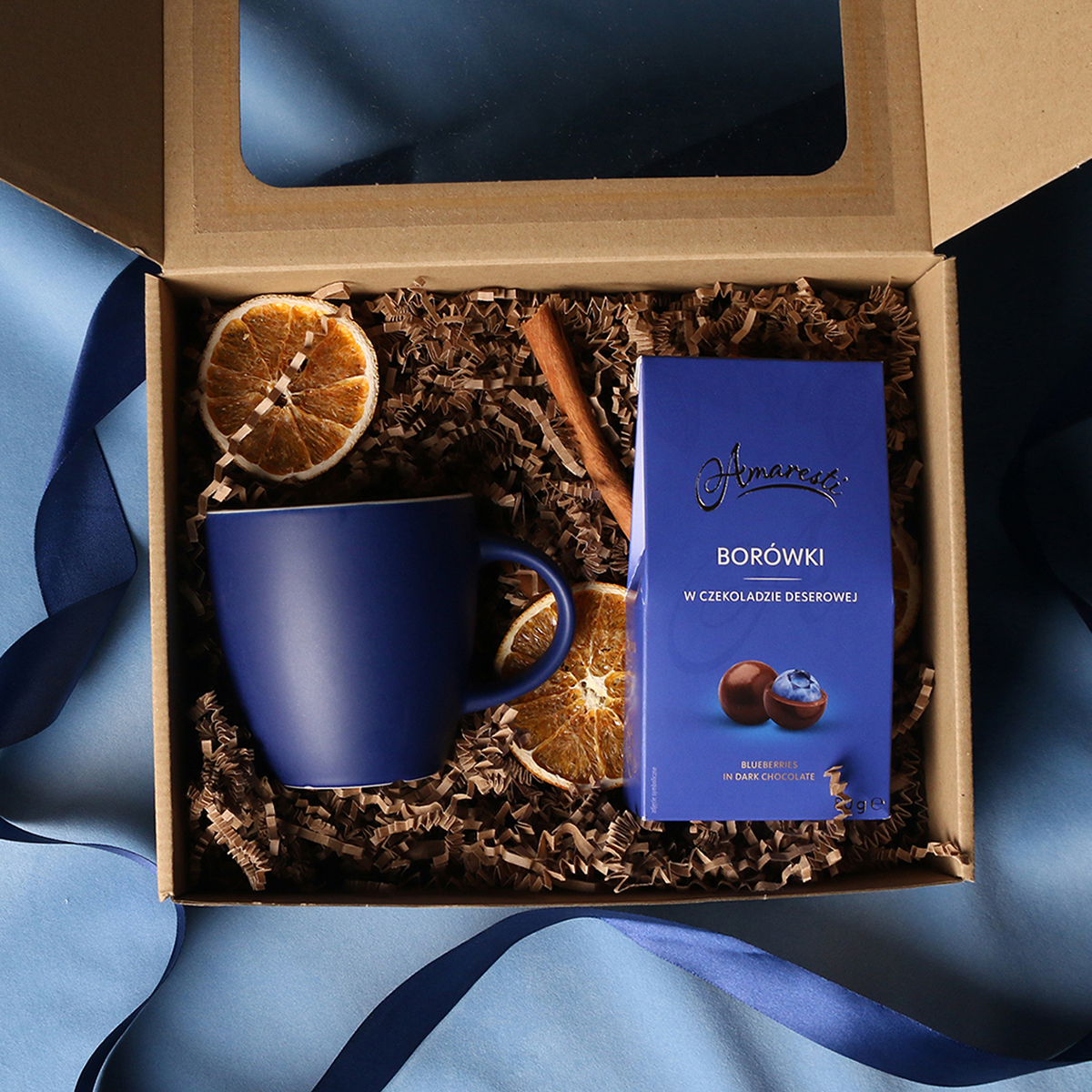 W skład zestawu wchodzą: kubek Fiord czerwono-biały / granatowy-biały / czarny-biały z możliwością zdobienia,  Divine Pralines - żurawina w czekoladzie (czerwony) / borówki w czekoladzie (granatowy) / skórka pomarańczy w czekoladzie (czarny) Całość w stylowym opakowaniu z tektury eco z okienkiem.  Opcje dodatkowej customizacji:  nadruk na kubku, bilecik z logo firmy, wstążka lub obwoluta  z motywem zimowym wzbogacona złoceniem